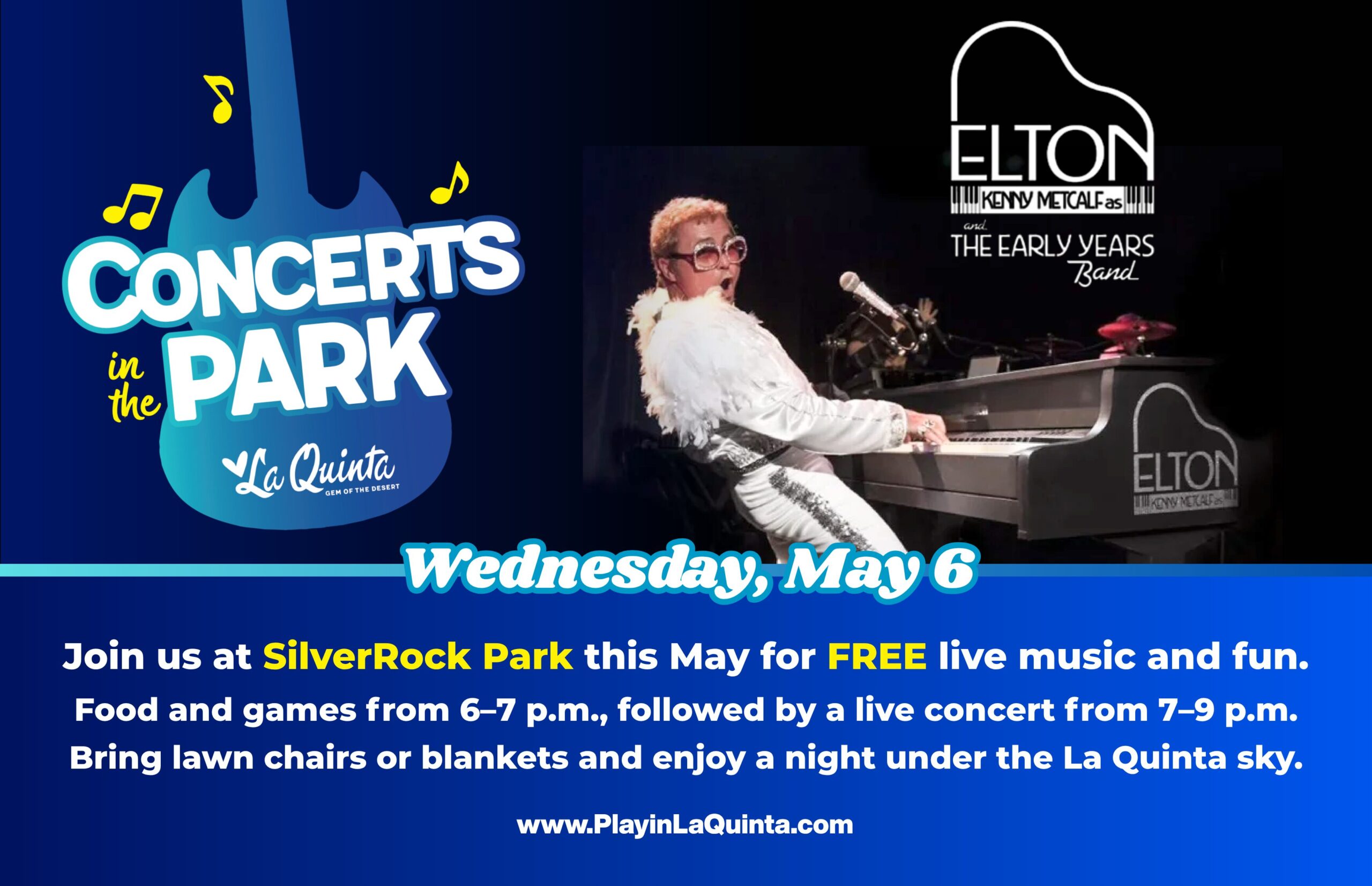 Join us in May at SilverRock Park for an evening of live music and fun. Food and games from 6–7 p.m., followed by live concerts from 7–9 p.m. Bring lawn chairs or blankets and enjoy a night under the La Quinta sky. May 6: Kenny Metcalf as Elton – The...