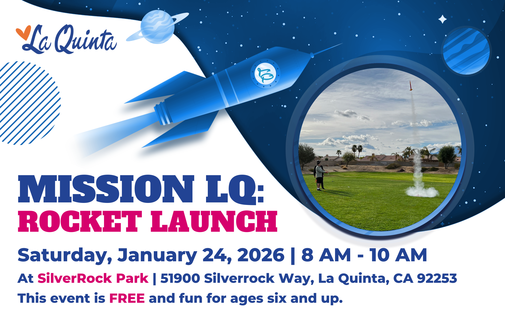 Mission LQ: Rocket Launch Get ready for an out-of-this-world experience! Join Mission LQ: Rocket Launch and learn how to build and launch small power rockets in a fun, safe, and controlled environment. This event is open to novice and experienced rocketeers ages 6 and up. La Quinta staff will provide step-by-step...